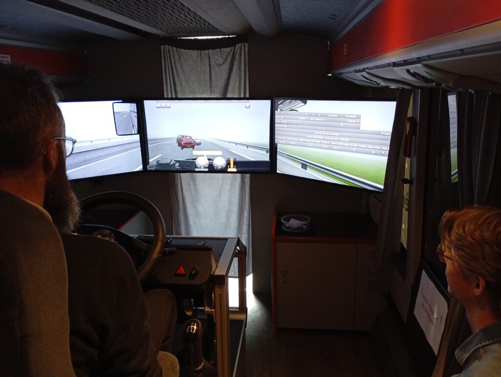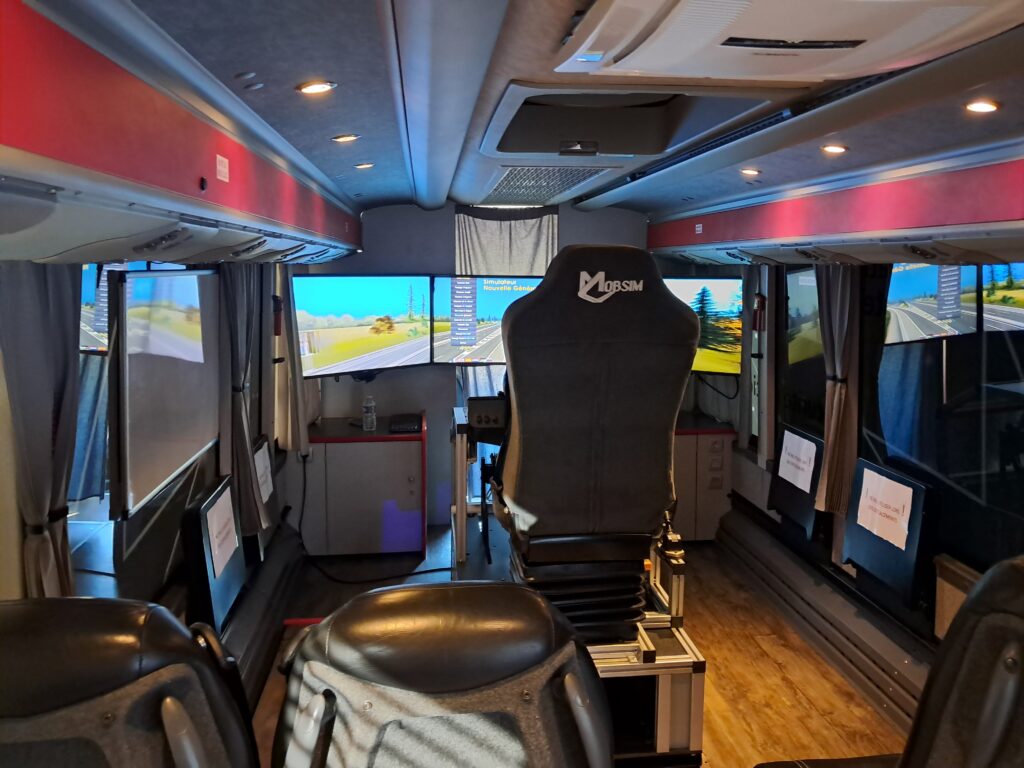 Le simulateur se déplace chez tous les adhérents du réseau Réunir. À l’extérieur, il ressemble à un car grand tourisme, mais à l’intérieur, c’est tout autre chose ! Le car est aménagé, et dispose de trois grands écrans qui reproduisent le paysage routier.